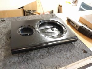 Here is the baffle with the slightly messed-up corner. I decided to not do another coat of paint, but either live with it or use a sharpie and black nail polish as a backup plan…